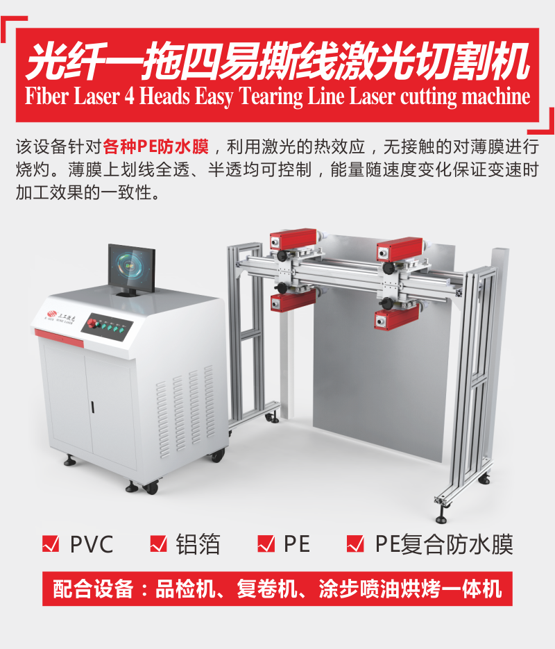 防水膜易撕線激光打標機,適用于自粘式/防水/防潮卷材、防水膠帶等材料。速度快、使用方便,適用于有新工藝要求的防水膜廠家。加工速度≥230米/分,可配合吹膜機、涂布機、分切機使用。